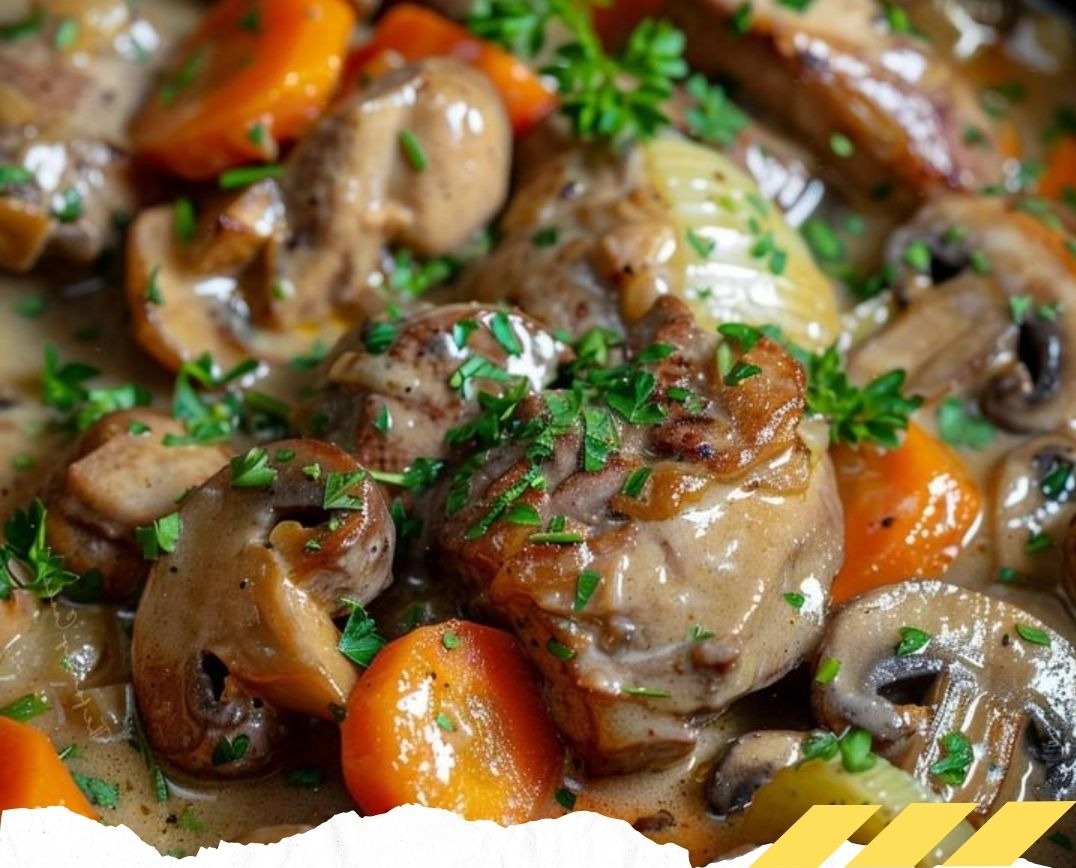 6. Incorporer les champignons et les morceaux de veau dans la sauce, laisser mijoter encore 10 minutes.