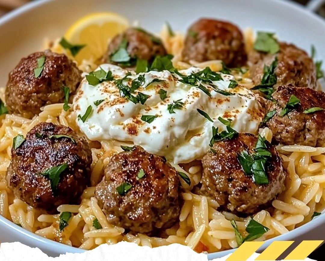 4- Servez les boulettes chaudes sur un lit d’orzo citronné et ajoutez une cuillerée généreuse de crème de feta. Parsemez de persil frais pour la touche finale.