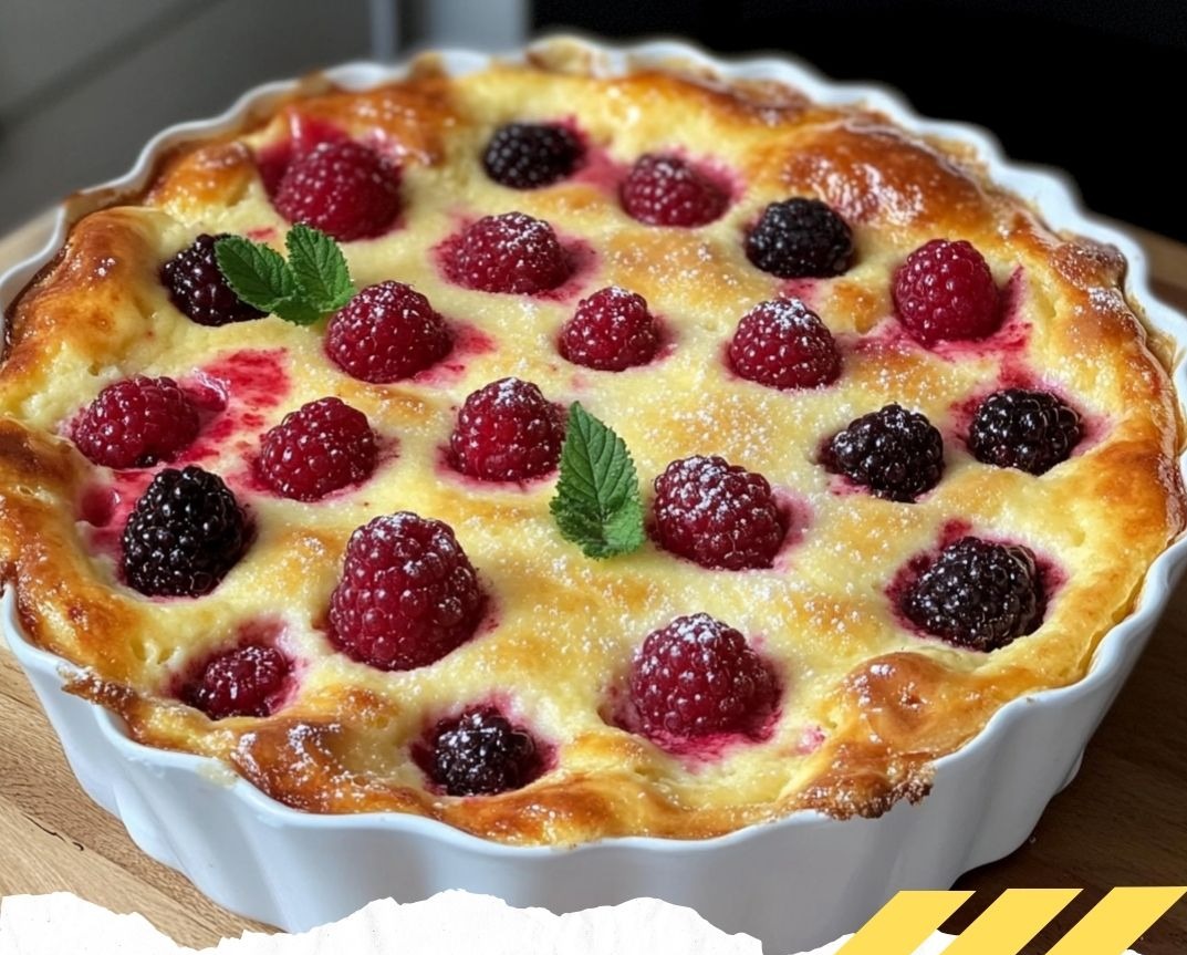 7- Verser délicatement la pâte à clafoutis sur les fruits rouges.