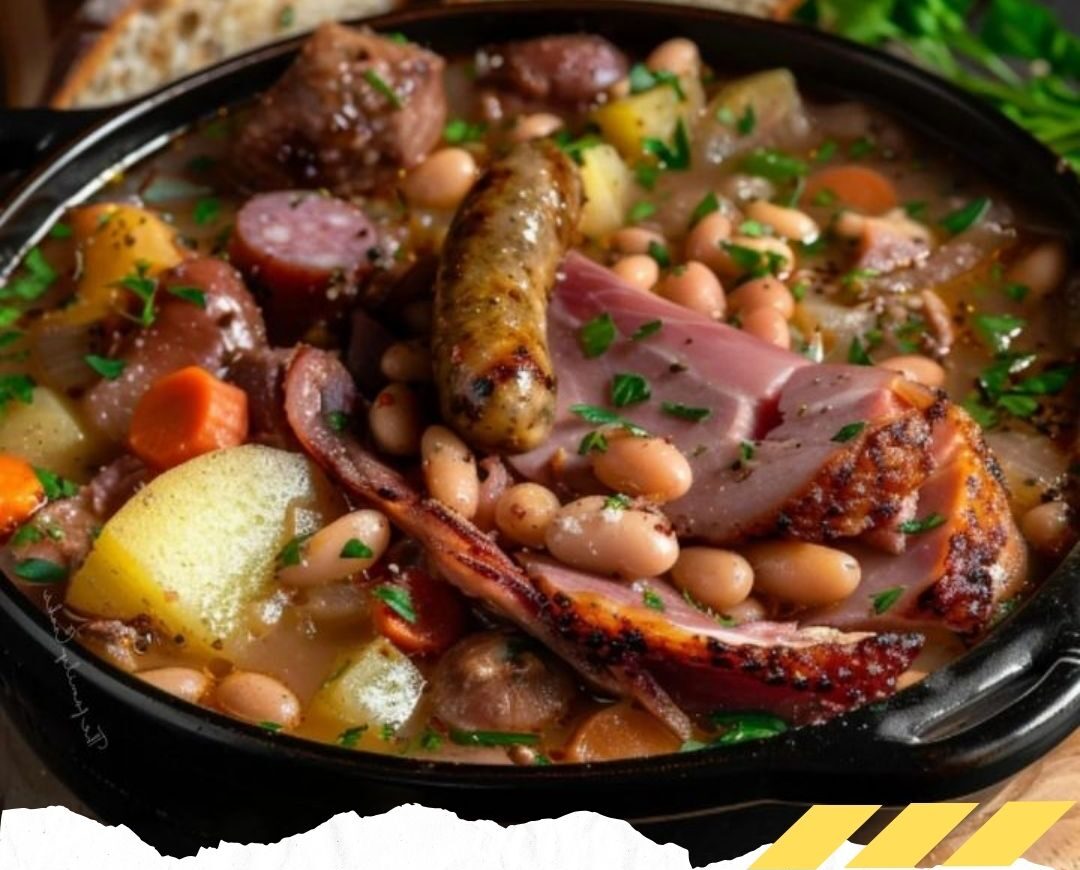 5. Disposez les tranches de jambon, les haricots égouttés et le bouquet garni dans une grande marmite. Ajoutez le bouillon de volaille et portez à ébullition. Baissez le feu et faites cuire à petits frémissements pendant 45 minutes.