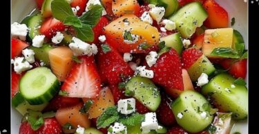Salade de fraises, melon, concombre, fromage feta et sa vinaigrette sucrée