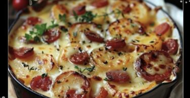 Gratin de pommes de terre, chorizo, tomate et béchamel