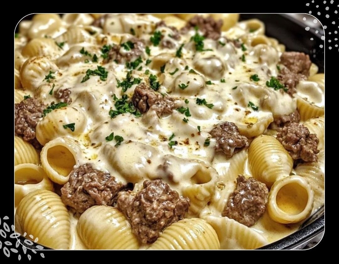 Pâtes aux coquilles et bœuf dans une sauce crémeuse à l’ail et au parmesan