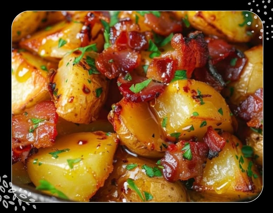 9- Versez les lardons au miel et à la sauce soja sur les pommes de terre.
