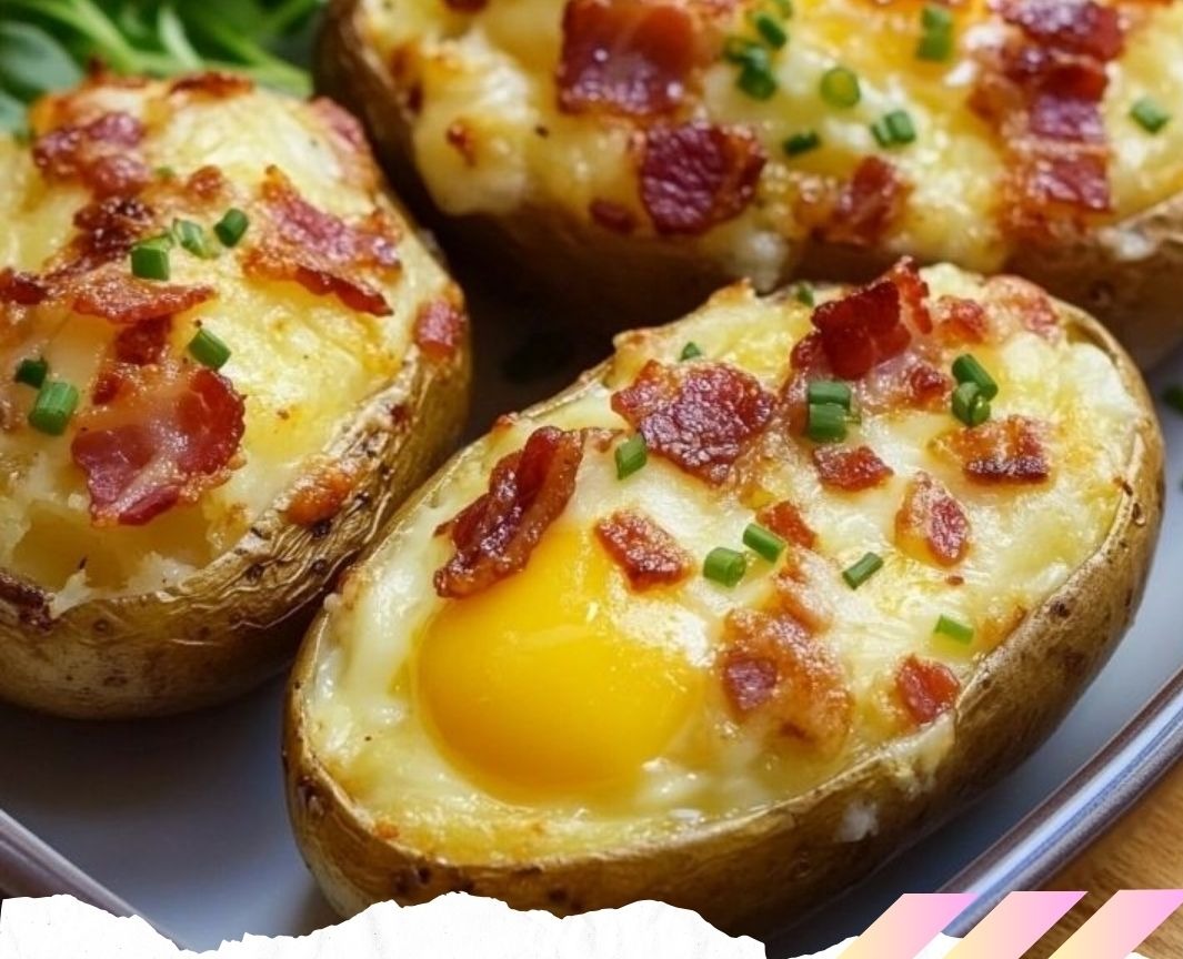 6. Cassez un œuf dans chaque pomme de terre farcie, ajoutez le reste de brie et de lardons, puis faites cuire au four pendant environ 6 minutes, jusqu’à ce que les blancs soient bien pris.