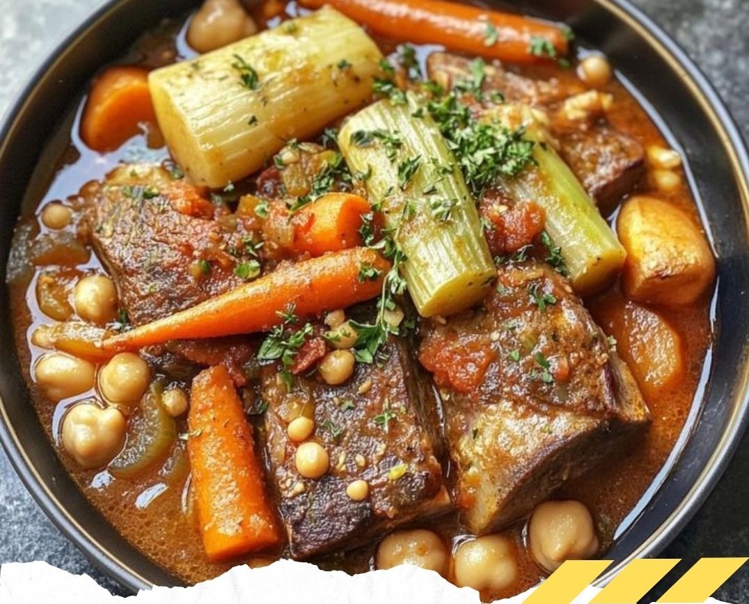 10. Égoutter viandes et légumes, disposer dans un plat creux préchauffé pour servir.