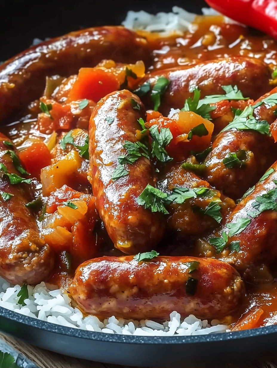 Laissez mijoter à feu doux pendant environ 15-20 minutes, en remuant de temps en temps, jusqu’à ce que la sauce épaississe et que les saucisses soient bien chaudes.