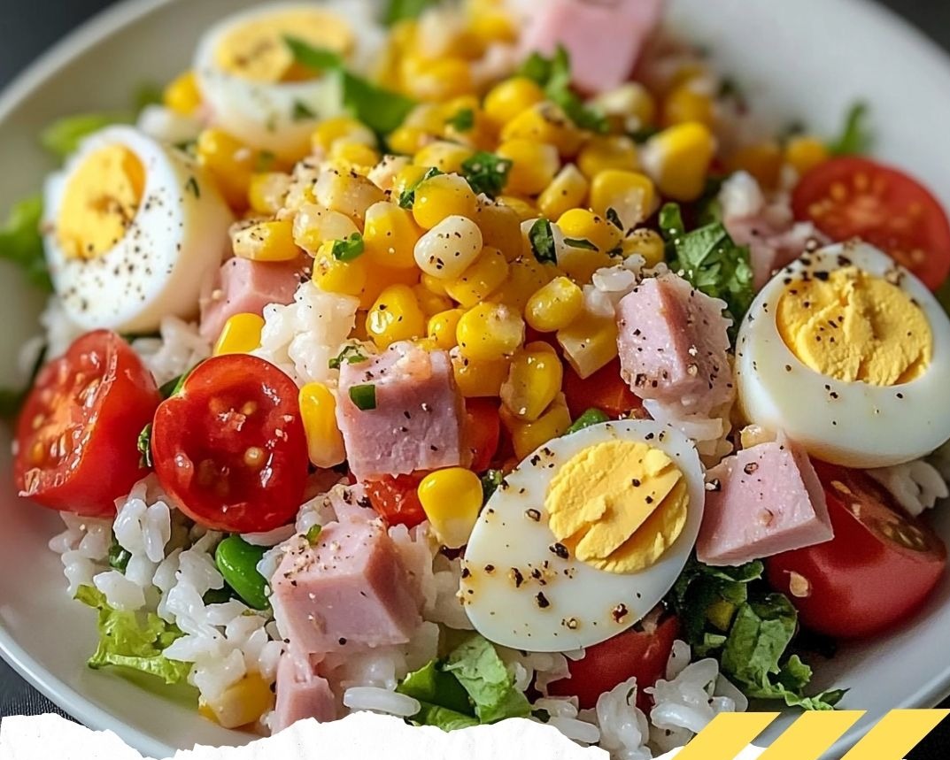 Salade Composée Fraîche Et Colorée : Riz, Tomates, Maïs, Jambon Et Œufs