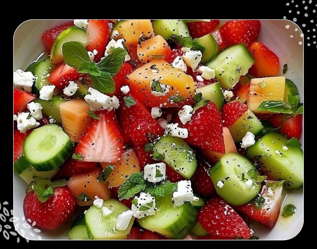 Salade de fraises, melon, concombre, fromage feta et sa vinaigrette sucrée