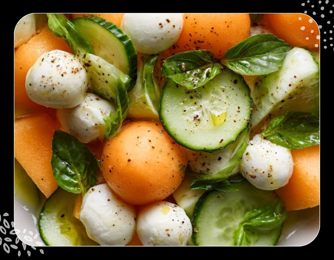 4- Dans une grande assiette ou un plat large, dispose le melon, le concombre et la mozzarella de manière équilibrée.