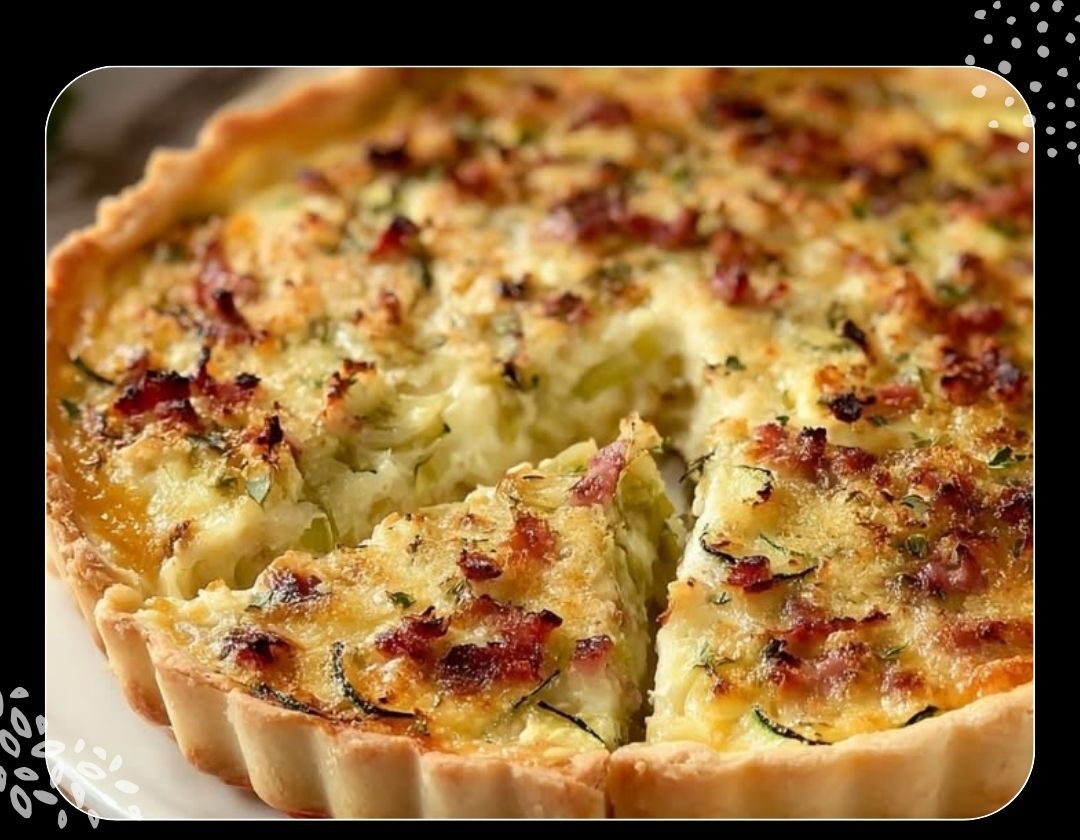 5- Répartissez les légumes et les lardons sur la pâte, puis versez le mélange œuf-crème par-dessus.